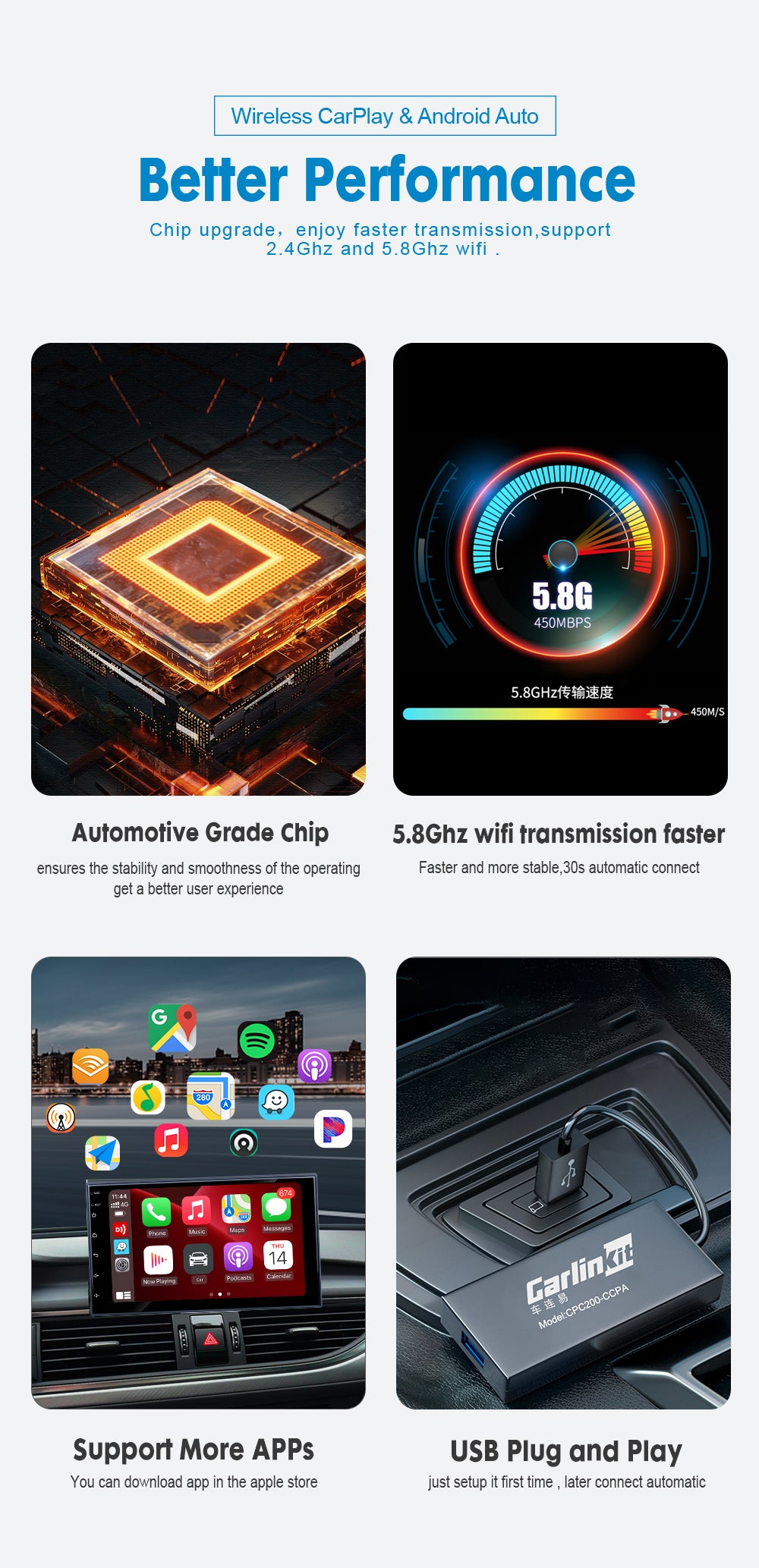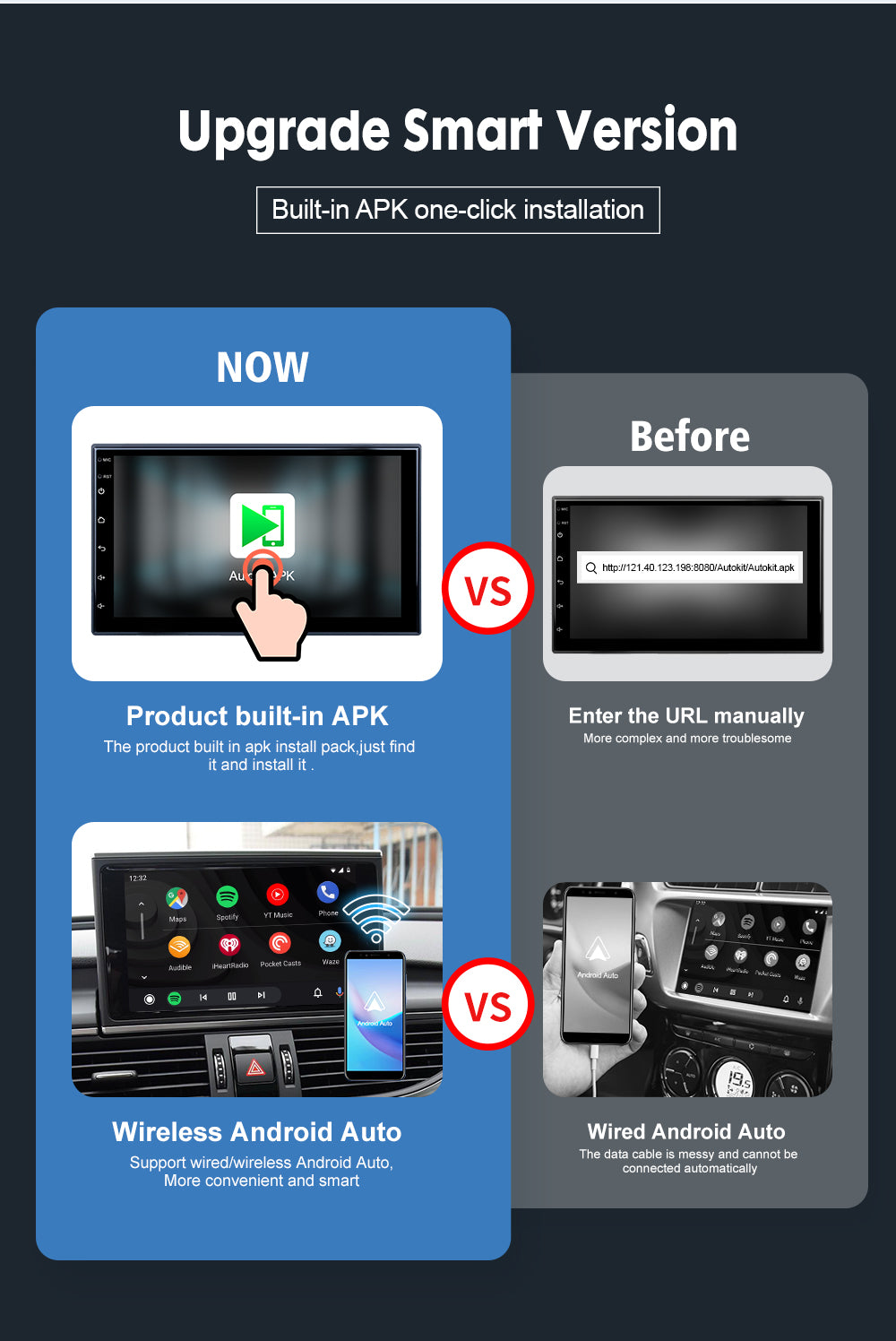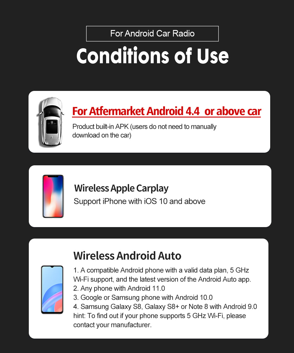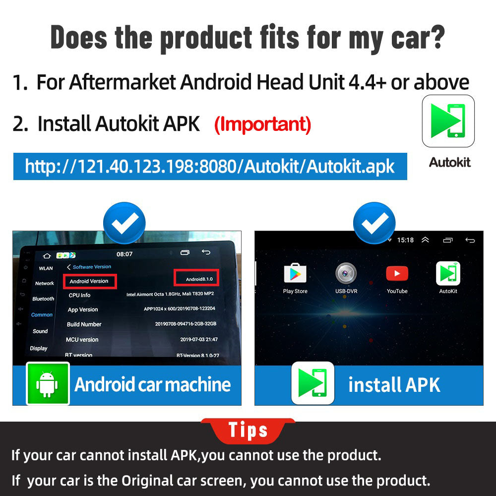 【Wireless Connect Easily】Apple CarPlay/AA Wireless USB Dongle. It can quickly convert wireless CarPlay/ wireless Android Auto after downloading the APK. (Please test whether the car can download the APK) Compatible Devices- support iPhone with iOS ( 7.1 and above). Android mobile phones(5 .1 and above). Car stereos with android version (4.4.2 and above). ONLY supports Aftermarket Android Radio, NOT suitable for original car screen.