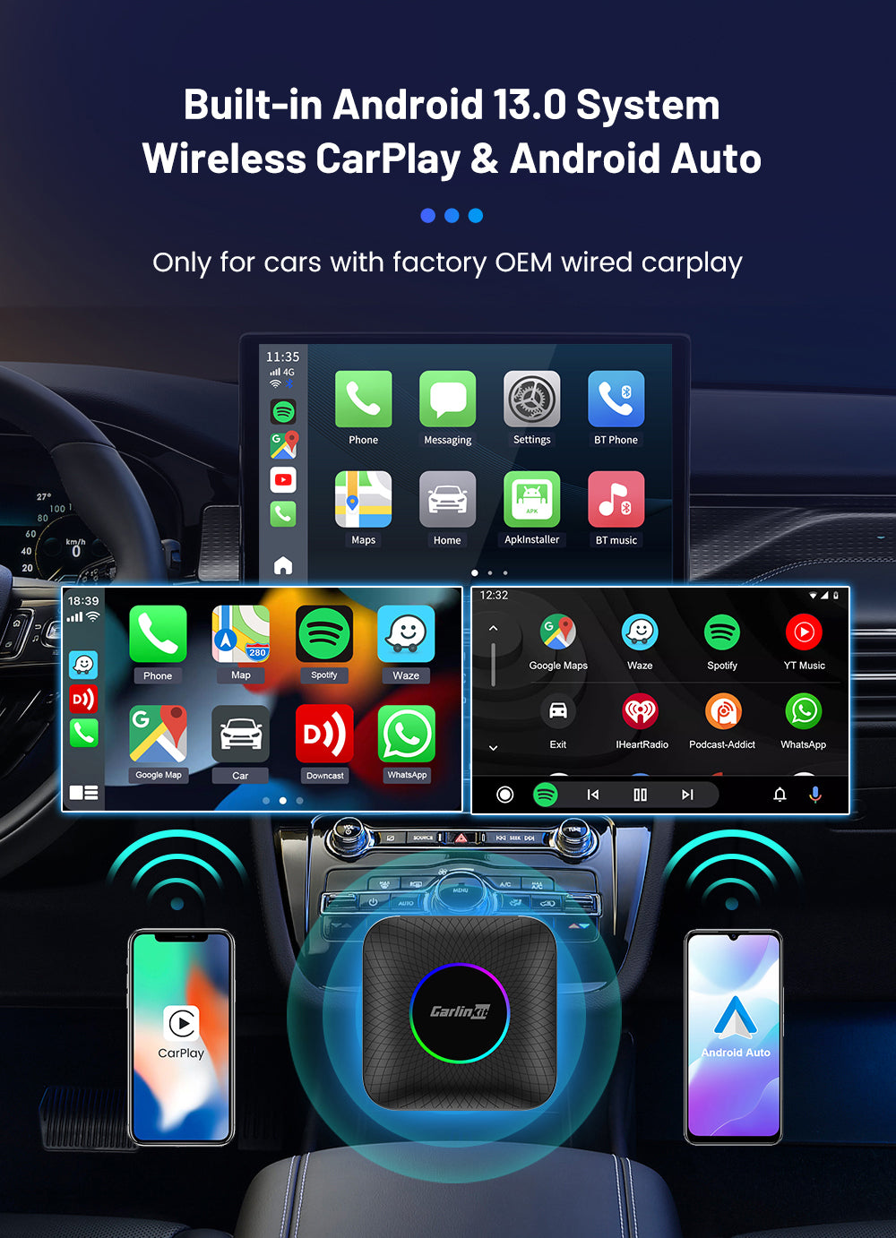 ✨ Système Android 13.0 le plus récent, prend en charge CarPlay sans fil, Android Auto sans fil, vous pouvez choisir entre deux systèmes : cliquez sur l'icône « Autokit » pour accéder à CarPlay sans fil ou Android Auto sans fil. Compatible avec les téléphones iPhone et Android, prend en charge la mise à niveau en ligne FOTA.